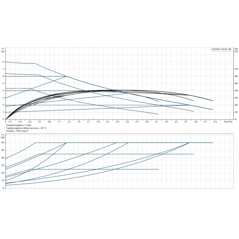 Čerpadlo ALPHA1 je vybaveno inteligentním řízením a nabízí tři řídicí režimy: konstantní tlak, proporcionální tlak a konstantní křivku. Každý režim je možné nastavit na tři rychlosti.