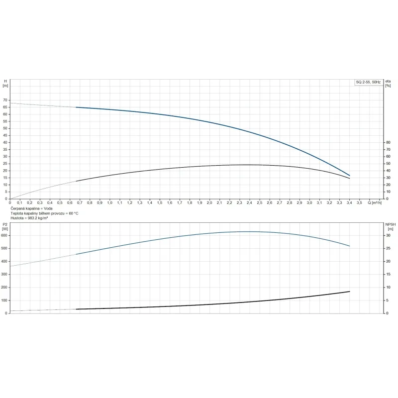 - Vynikající výkon - jmenovitý průtok 2 m³/h při dopravní výšce 54 m (max. až 67 m)