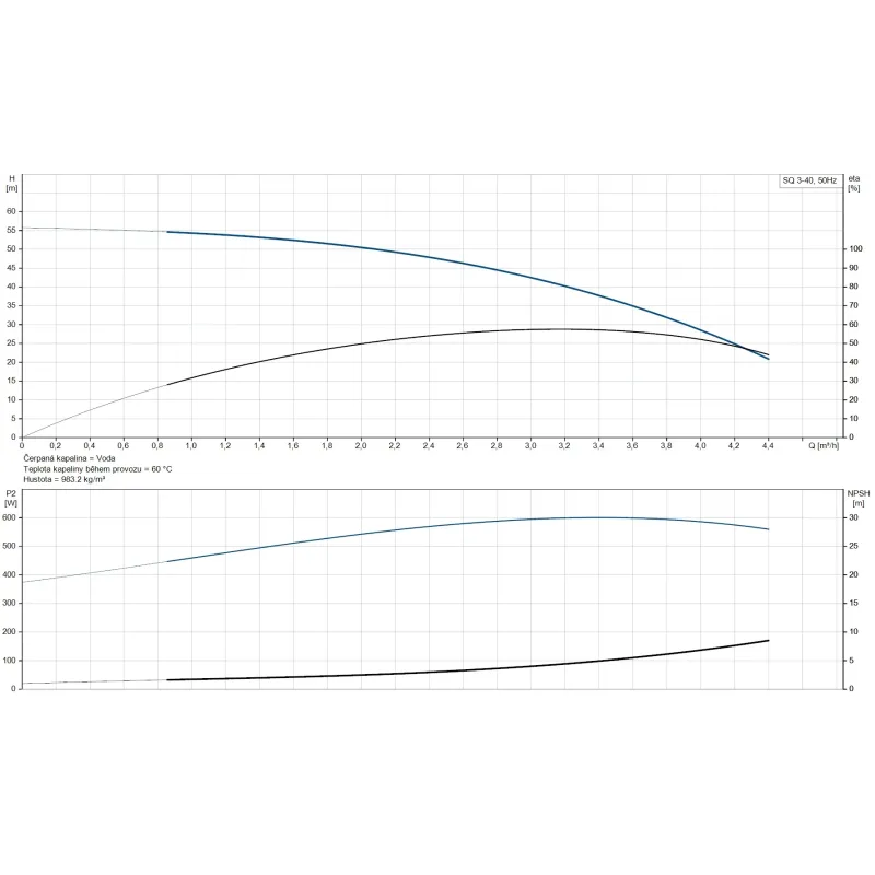 - Jmenovitý průtok 3 m³/h s dopravní výškou 42 m a maximálním provozním tlakem 15 bar