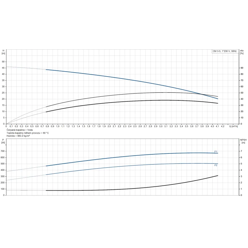 - Vysoký výkon a účinnost - jmenovitý průtok 3,1 m³/h a dopravní výška 34,46 m s indexem minimální účinnosti MEI ≥ 0,7
