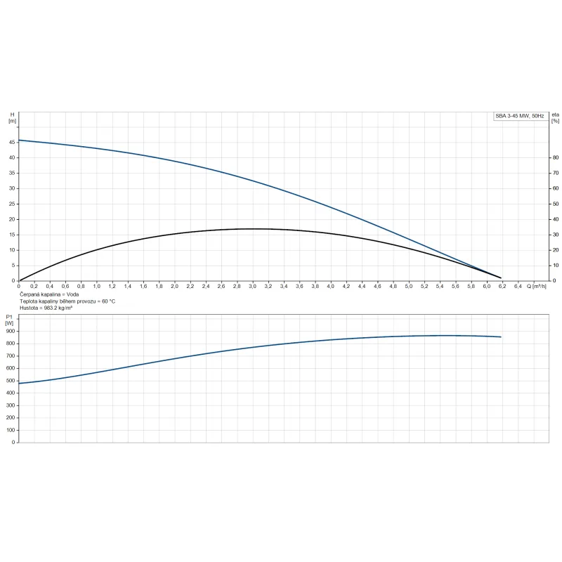 - Výkonné parametry - jmenovitý průtok 3 m³/h, maximální dopravní výška 45 m