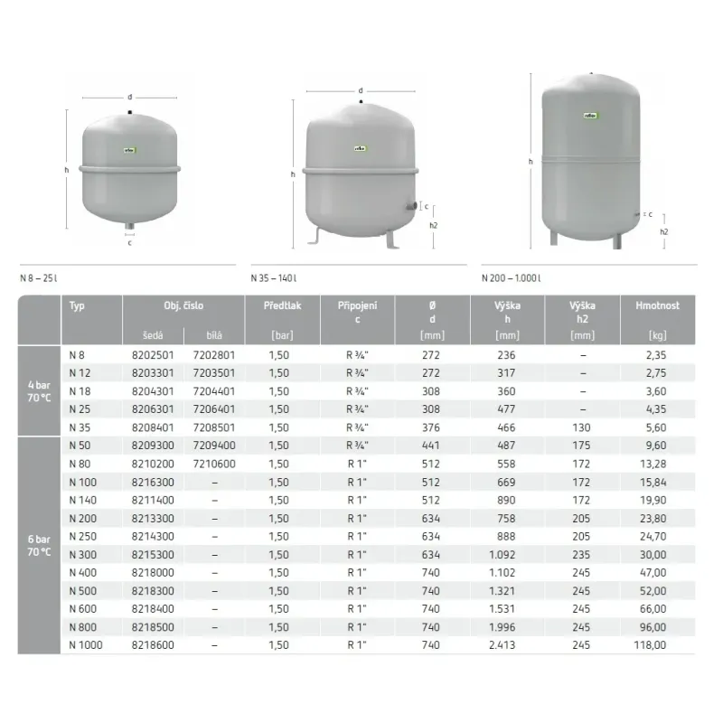 Tlaková expanzní nádoba s membránou pro uzavřené topné a chladicí soustavy. Nádoby v provedení podle DIN EN 13831. Povolení podle směrnice o tlakových zařízeních 2014/68/EU.