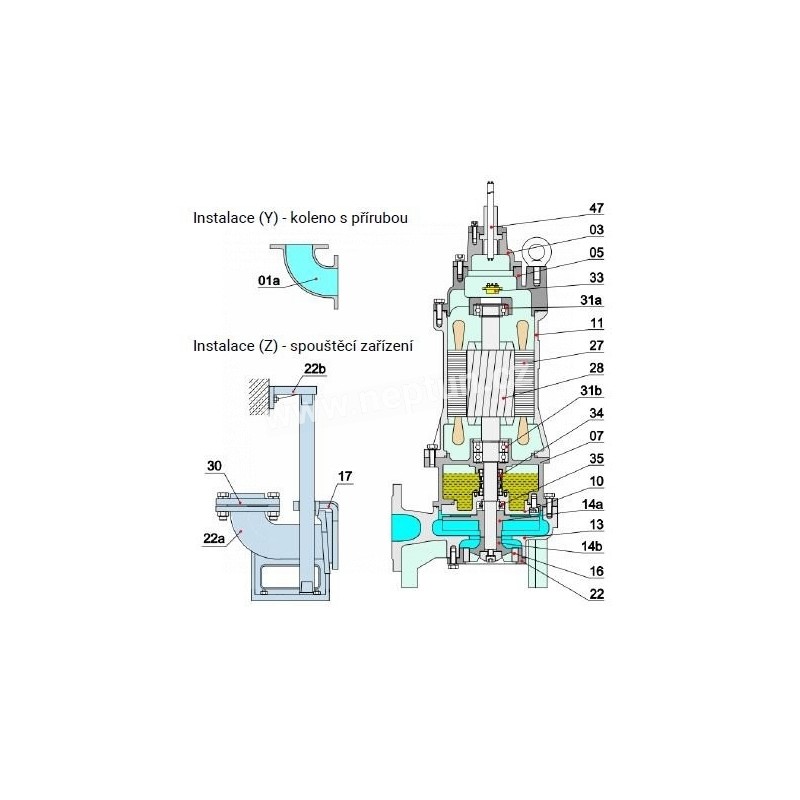 Kalové čerpadlo s řezacím zařízením. Vhodné pro čerpání odpadních vod obsahujících hrubé nečistoty, bez abrazivních příměsí.