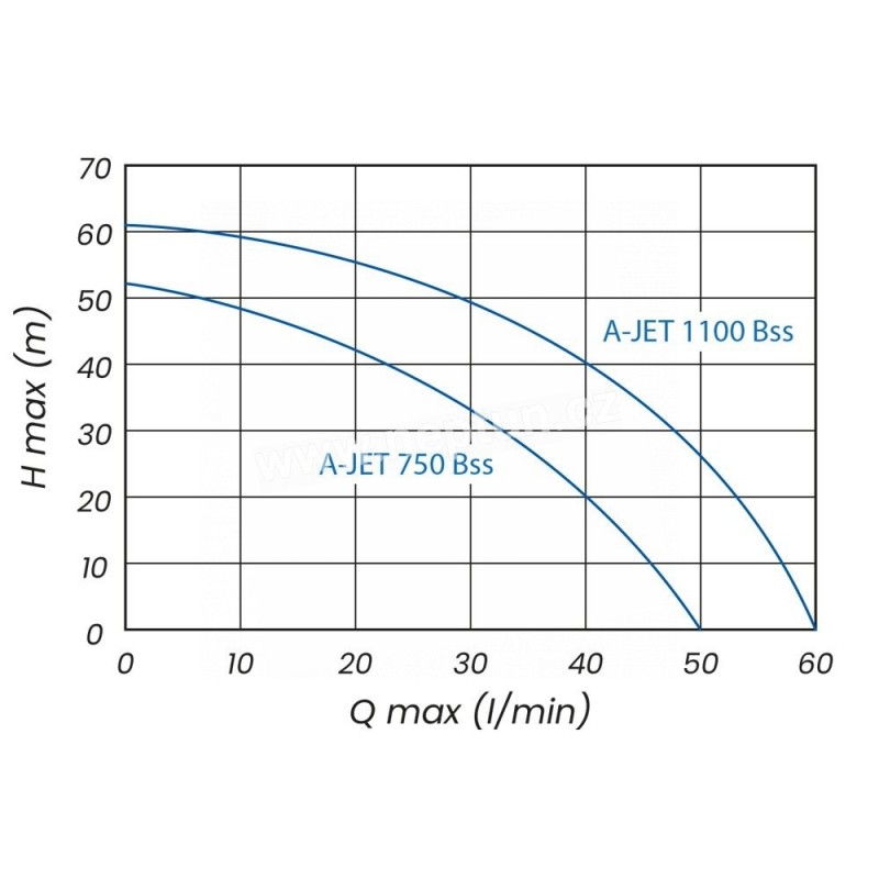 Samonasávací čerpadlo A-JET 750, A-JET 1100, s tělesem z litiny, kvalitním difusorem z technopolymeru, hřídelí z nerezové oceli, mosazným oběžným kolem.