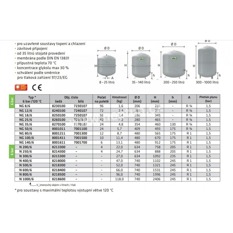 Tlaková expanzní nádoba s membránou pro uzavřené topné a chladicí soustavy. Nádoby v provedení podle DIN EN 13831. Povolení podle směrnice o tlakových zařízeních 2014/68/EU.